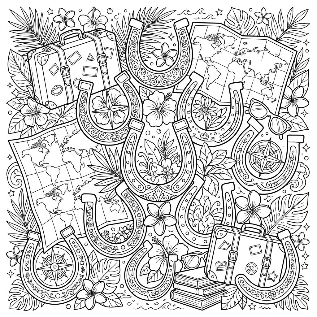This captivating coloring page presents a rich tapestry of lucky horseshoes, each one a canvas for intricate patterns and designs. They are gracefully arranged amidst a medley of classic vacation symbols, including charming vintage suitcases adorned with travel stickers, unfurled world maps inviting exploration, and vibrant tropical flowers like hibiscus and plumeria. Sunglasses, compass roses, and subtle background motifs of stars and waves complete this densely packed scene, promising hours of detailed coloring.
