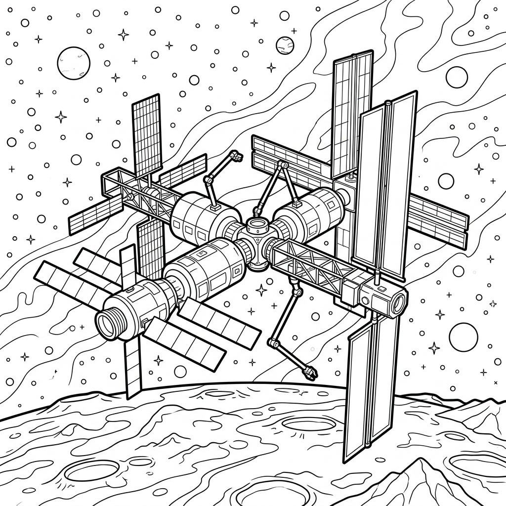 Bring this celestial masterpiece to life with a palette inspired by the cosmos. Use metallic silvers, deep space blues, and stark whites for the station's hull, and warm golds or rich yellows for the solar panels. Experiment with gradients for the nebulae and varied shades of grey for the Moon's textured surface. Don't forget to make the stars twinkle with bright yellows or even glitter, letting your imagination soar as you personalize this epic journey through space.