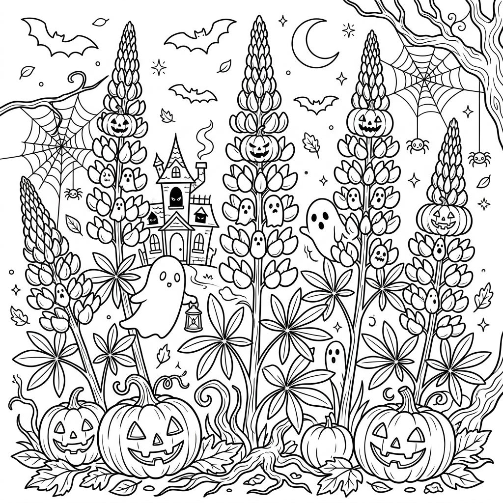 Step into a charmingly eerie garden where towering lupine flowers are artfully intertwined with classic Halloween motifs. This intricate coloring page showcases several majestic lupine stalks, each adorned with delightful details like smiling jack-o'-lanterns resting atop their spiky blooms. Among the lush foliage and broad leaves, you'll discover whimsical ghosts floating playfully, one even carrying a tiny lantern, while a quaint haunted house peeks out from the background, adding a touch of mystery to this floral fright.