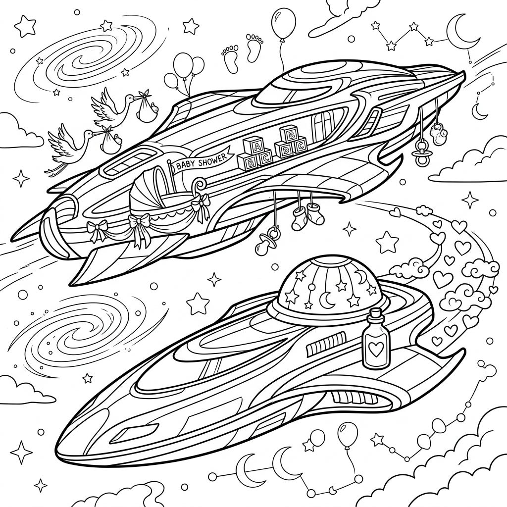 Embark on a cosmic journey of creativity with this extraordinary coloring page, where advanced luxury liners transform into a grand celebration of new life! This intricate design showcases two magnificent, futuristic spaceships gliding through the vastness of space. The upper vessel is a joyous spectacle, adorned with an adorable "BABY SHOWER" banner, a delicately hanging baby cradle, and playful accents like building blocks, tiny pacifiers, and booties. Overhead, graceful storks deliver bundles of joy, adding a classic touch to this futuristic scene.