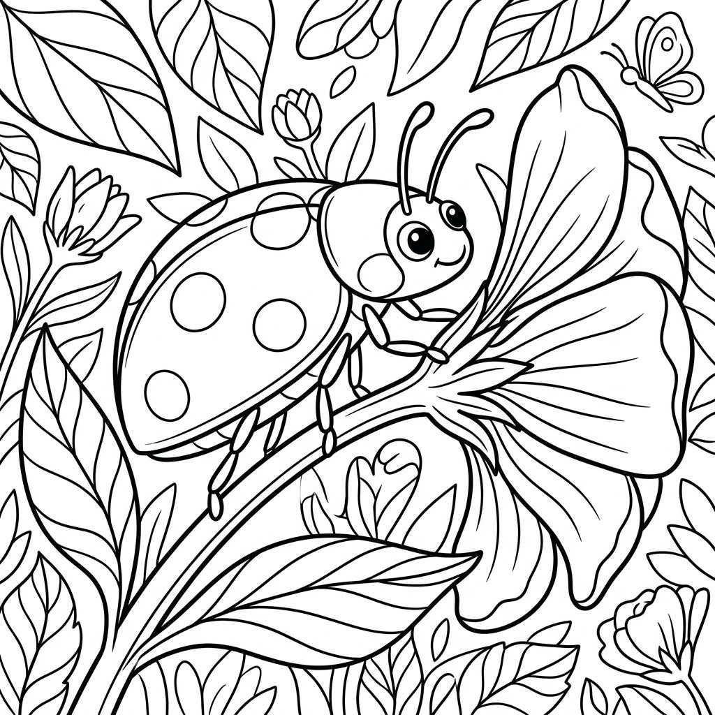 Explore the enchanting world up close with our 'Macro Photography x Kids' coloring template! This captivating design brings you face-to-face with a cheerful ladybug, complete with its iconic spotted shell, as it gently rests on the delicate petals of a beautiful flower. Surrounded by lush leaves and budding blossoms, and with a tiny butterfly fluttering by, this intricate scene captures the magic of a garden at its finest, all presented in a detailed, accessible line art style perfect for young hands.