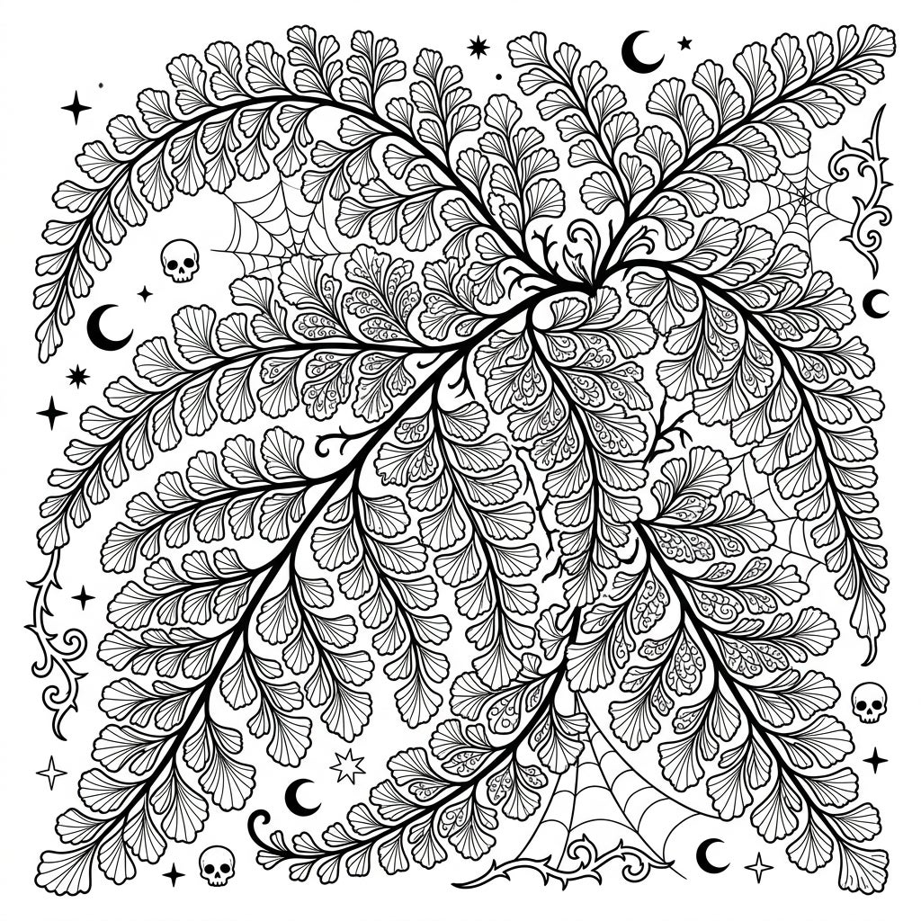 Explore the delicate beauty of maidenhair ferns intertwined with classic gothic motifs like spiderwebs and skulls. This intricate coloring page offers a captivating blend of nature and dark elegance for your creative escape.