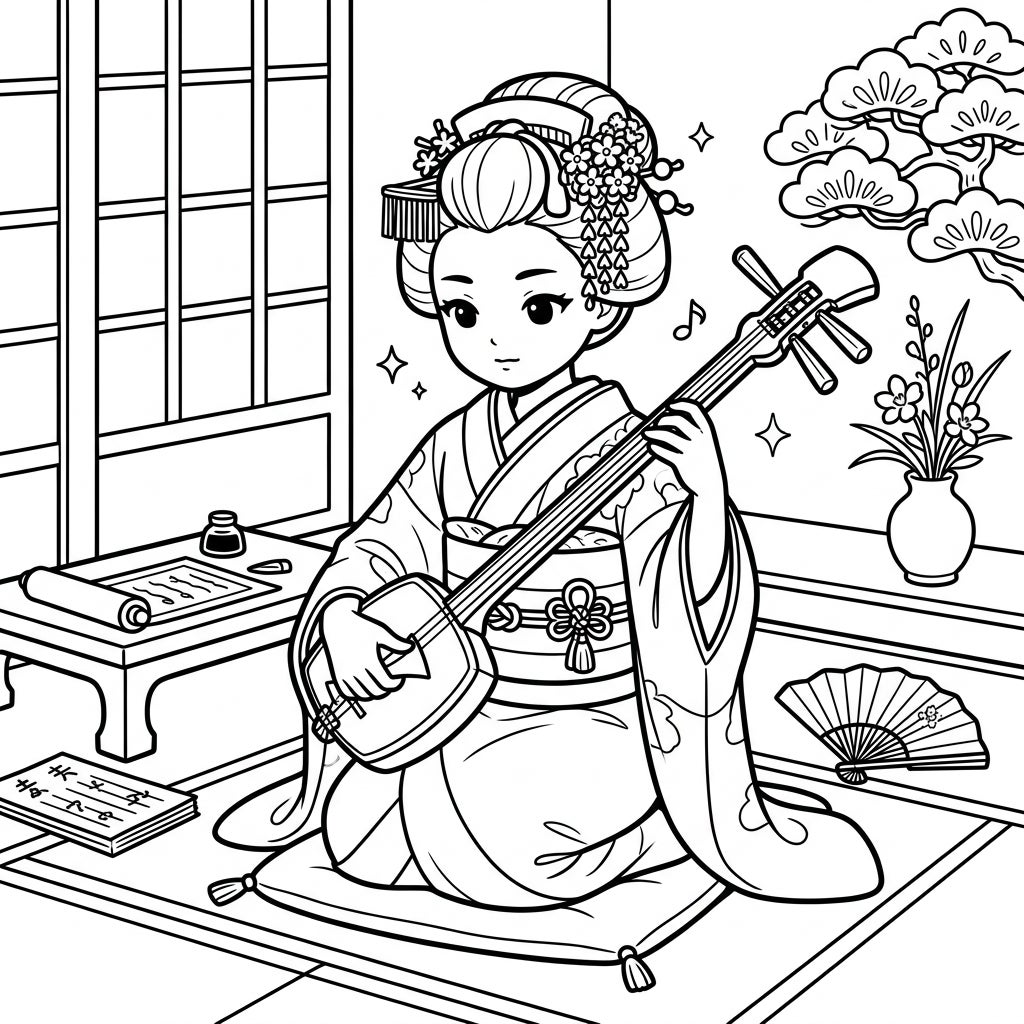 This charming illustration captures a moment of quiet dedication, offering children a wonderful introduction to the elegance of Japanese culture and its traditional arts. It highlights the discipline and beauty of a Maiko's training, emphasizing the importance of music and cultural heritage. The scene invites young artists to imagine the melodic notes filling the room, fostering an appreciation for global traditions and the focus required to master a musical instrument.