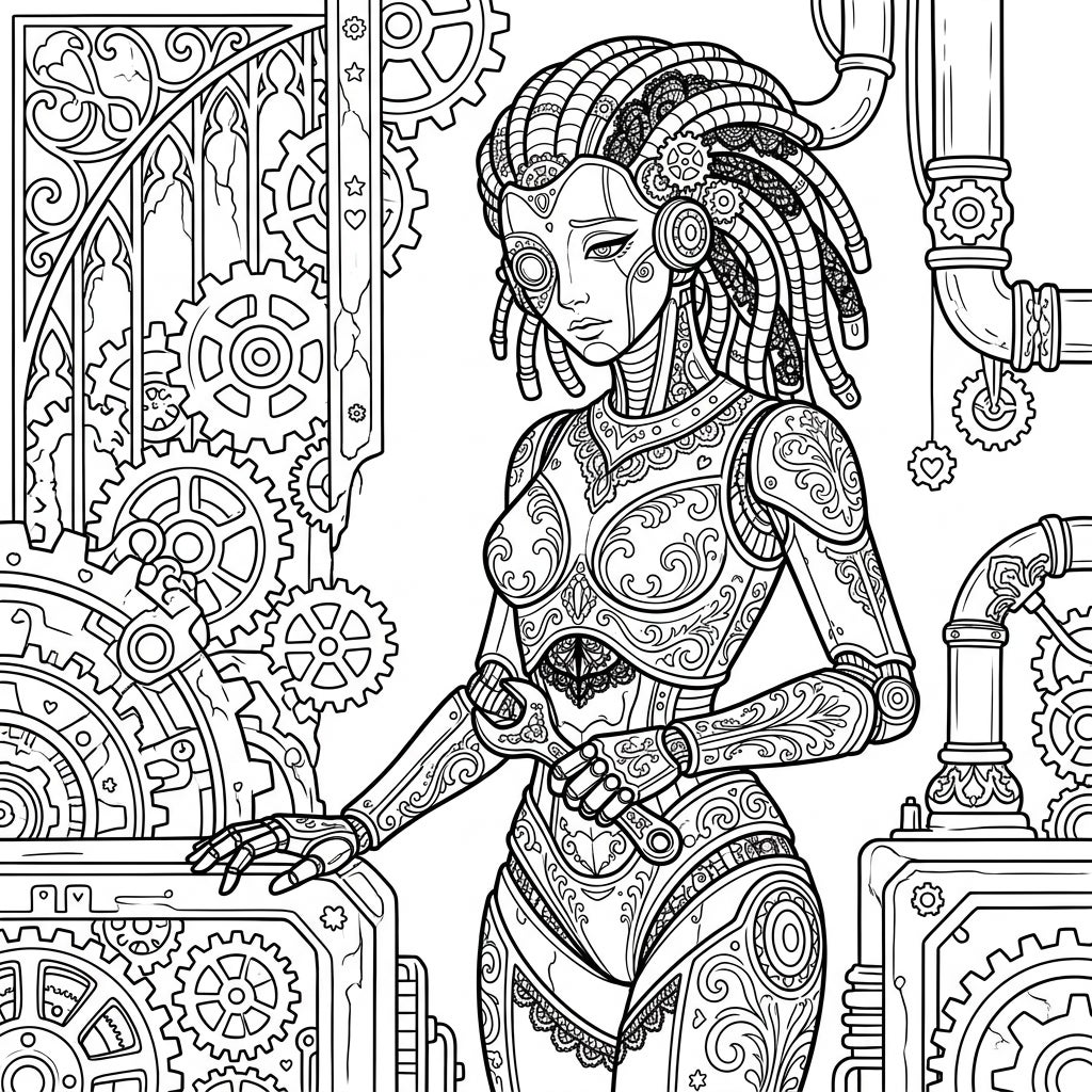 Step into a captivating fusion of futuristic technology and ancient allure with our Gothic Maintenance Cyborg coloring template. This stunning design features a humanoid cyborg adorned with exquisitely detailed Victorian lace patterns, intricate filigree, and a melancholic elegance that defines the Gothic aesthetic. Her form is a masterpiece of mechanical art, complete with dreadlock-like wiring for hair and delicate gears integrated into her structure, all meticulously crafted for an engaging coloring experience.
