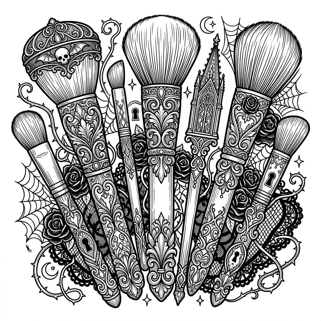 Dive into a realm of dark beauty with this exquisite coloring template showcasing an intricate collection of makeup brushes. Each of the seven brushes features a lavishly decorated handle, reminiscent of Victorian-era artistry, adorned with swirling filigree, delicate roses, and eerie spiderwebs. Look closely, and you'll discover charmingly macabre details like a tiny skull peering from one brush cap, keyhole designs embedded in others, and even a handle sculpted into a miniature gothic cathedral spire, all set against a backdrop of thorny vines and celestial elements like a crescent moon and twinkling stars.