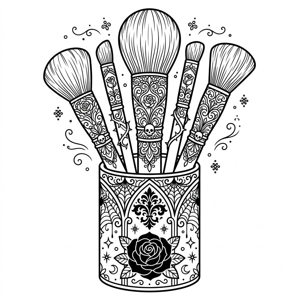 This captivating coloring template presents a stunning collection of five makeup brushes, each a masterpiece of gothic design, arranged neatly within an equally intricate cylindrical holder. The handles of these beauty tools are adorned with a rich tapestry of details, including delicate skulls, thorny rose vines, and swirling Victorian-inspired lace patterns. The holder itself is a visual feast, showcasing detailed spiderwebs, a prominent central gothic arch with a fleur-de-lis motif, and a striking solid black rose at its base, all framed by whimsical stars and crescent moons, inviting you to explore every fine line.