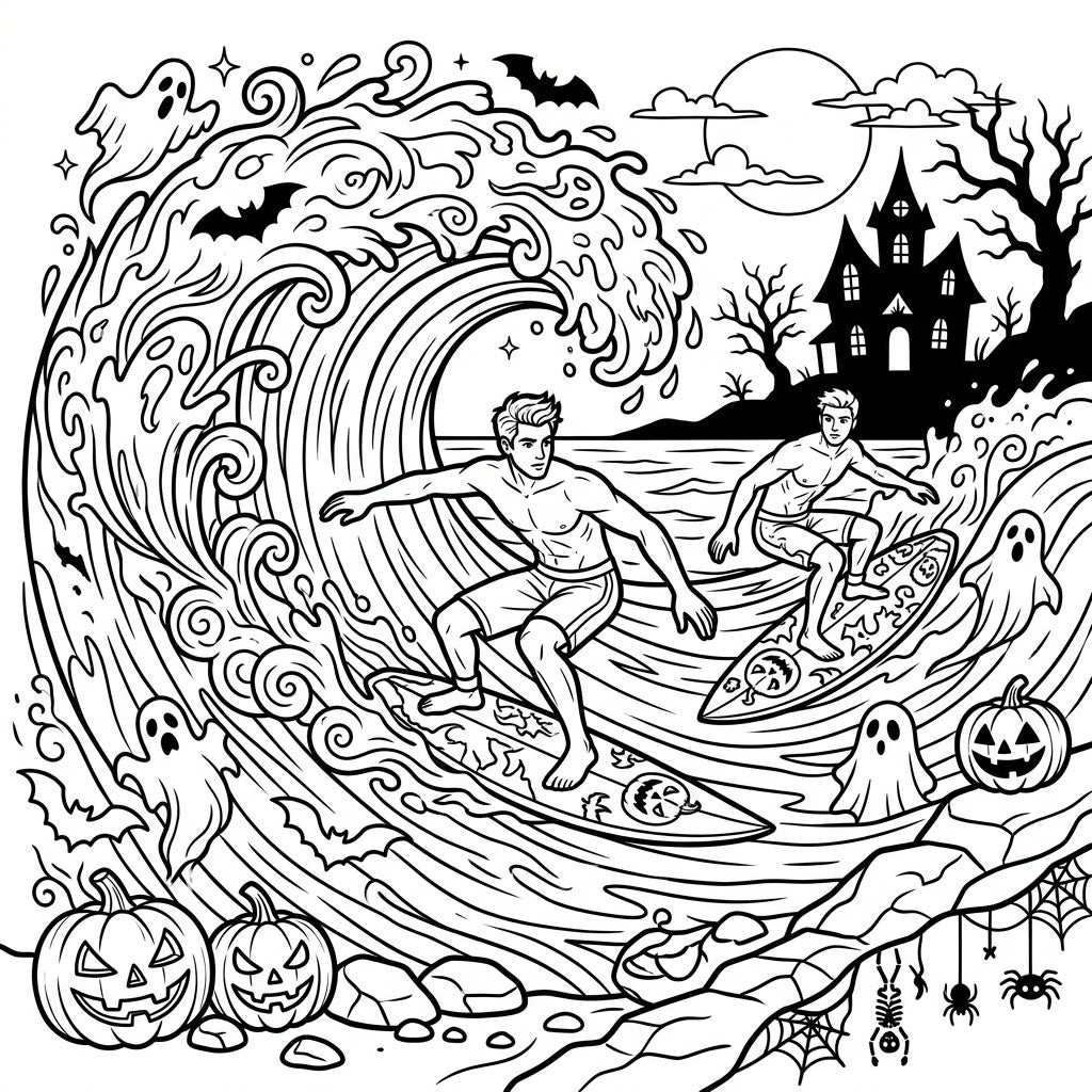 Unleash your creativity as you bring this dynamic scene to life! Experiment with vibrant blues and greens for the powerful waves, contrasting them with eerie purples and oranges for the Halloween elements. Give the surfers sun-kissed skin and patterned board shorts, and imagine the glow from the jack-o'-lanterns. Whether you prefer classic Halloween hues or something entirely new, this coloring page provides a fantastic canvas to practice shading, blending, and adding your personal artistic flair. Grab your favorite coloring tools and let the spooky surf adventure begin!