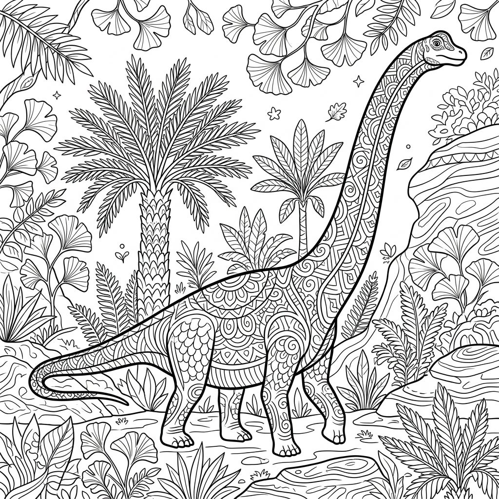 Step back in time to a prehistoric era with our captivating Mamenchisaurus adult coloring page. This magnificent long-necked dinosaur, known for its exceptional length, is depicted with an array of stunning, intricate patterns adorning its body, inviting you to lose yourself in every stroke. The detailed scene places the Mamenchisaurus within a lush primeval landscape, complete with towering palm trees, unique ginkgo leaves, and various ferns, all rendered with fine lines and thematic textures.