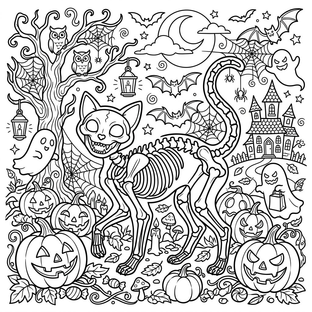 Unleash your creativity with this detailed Halloween coloring page featuring a grinning cat skeleton at its spooky heart. Surrounded by classic festive elements, it's perfect for a fun, artistic celebration.