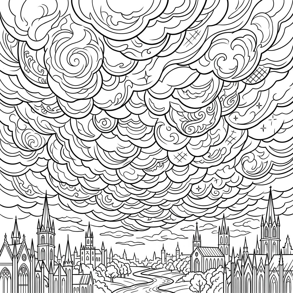 Unleash your creativity with this exquisitely detailed coloring page featuring a breathtaking gothic vista under a sky adorned with dramatic mammatus clouds. Each pouch-like cloud formation is rendered with ornate swirls and intricate patterns, creating a sense of mysterious depth. Below, a majestic gothic city rises with its towering spires, arched windows, and detailed facades, bordered by a tranquil winding river or path and scattered trees, all inviting you to bring them to life with your unique palette.