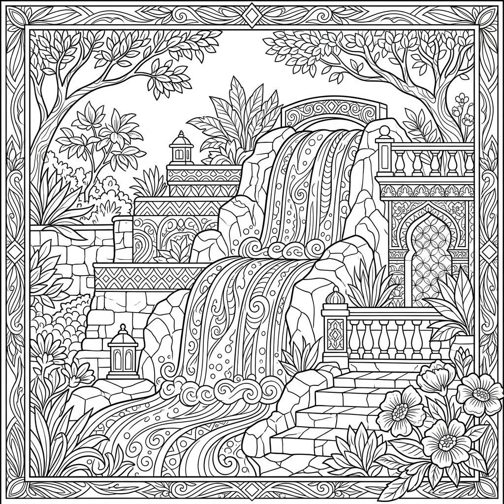 Dive into a world of intricate beauty with this stunning adult coloring page featuring a majestic man-made waterfall. Explore an ornate garden filled with delicate details, perfect for a relaxing and mindful coloring session.