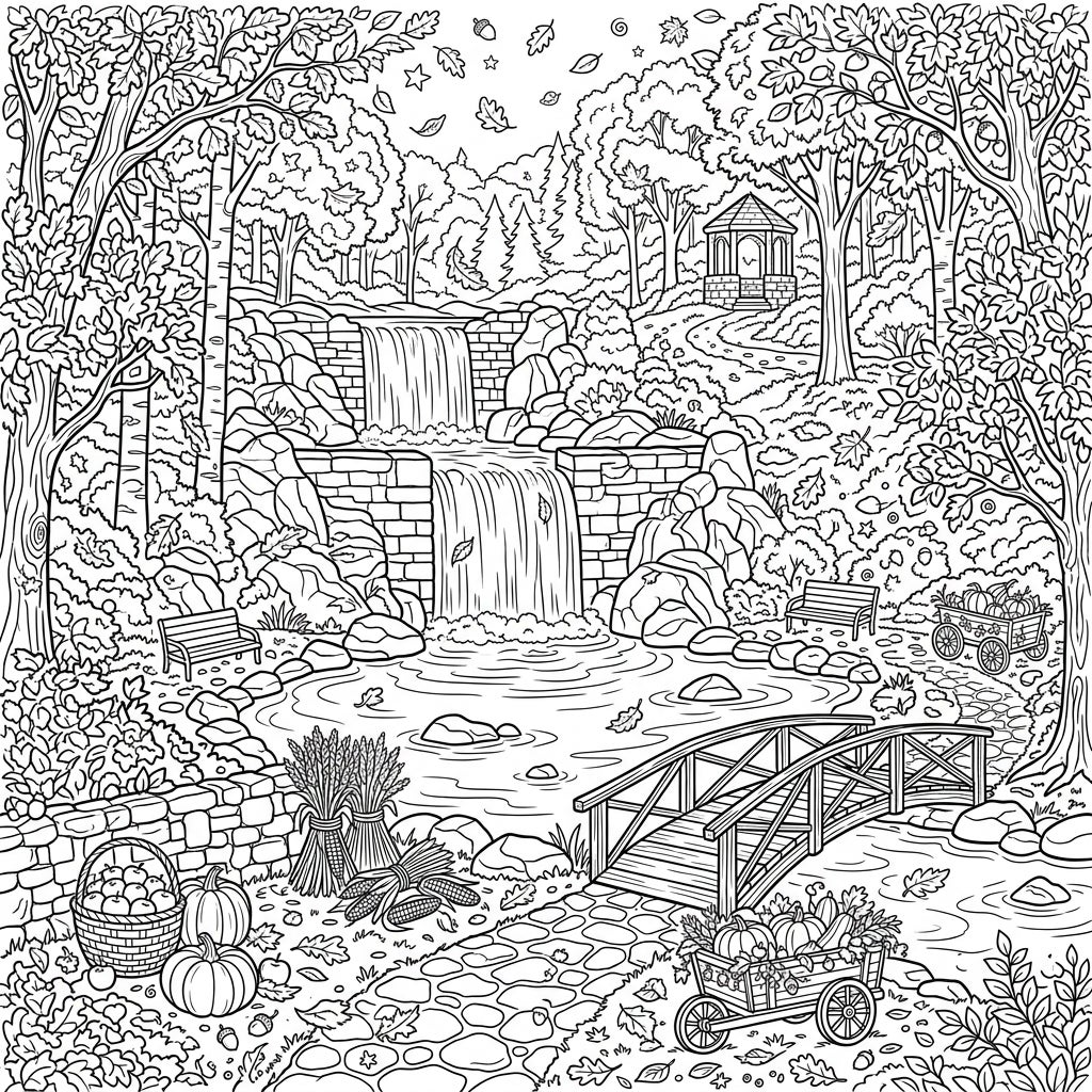 Step into a picturesque autumn landscape featuring stunning man-made waterfalls, surrounded by the rich bounty of fall. This detailed coloring page invites you to bring the vibrant colors of harvest season to life.