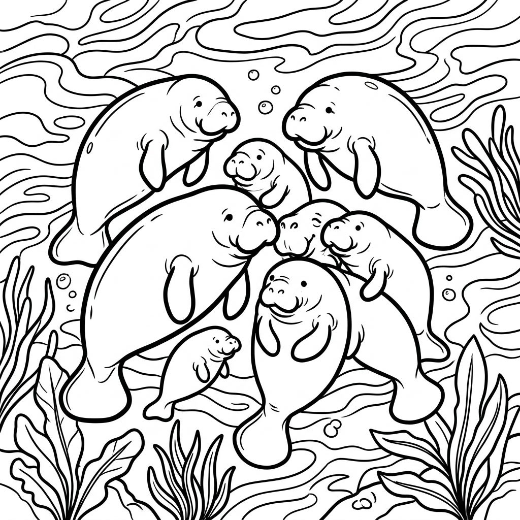 Delight in this heartwarming coloring page featuring a lively gathering of manatee herds. You'll find several gentle manatees, including friendly adults and their playful calves, swimming peacefully amidst stylized water ripples and chunky aquatic plants. The entire scene is crafted with ultra-thick outlines and large, iconic shapes, making it incredibly inviting and easy for the youngest artists to color.