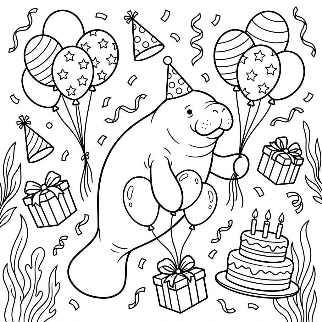 Get ready for an adorable underwater birthday bash with this charming manatee coloring page! Featuring a party-ready manatee surrounded by balloons, gifts, and cake, it's perfect for celebrating any special day.