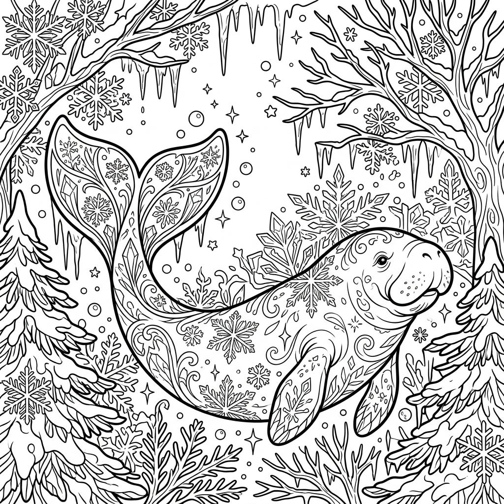 Embark on a creative journey with this unique coloring page featuring a graceful manatee amidst a serene winter wonderland. Its intricate patterns and snowy surroundings offer a delightful challenge for artists of all ages, blending marine life with frosty charm.