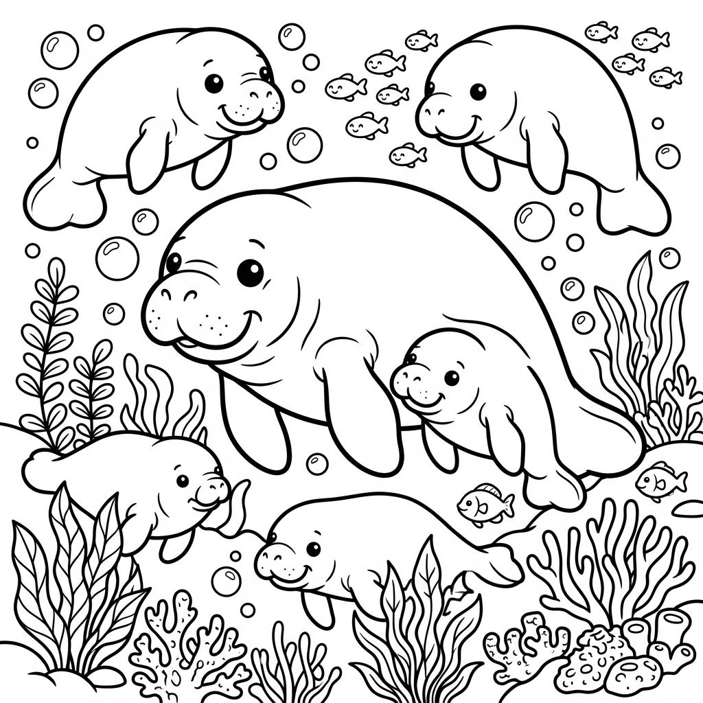 Prepare for an overload of charm with this enchanting Kawaii Manatees and Dugongs coloring page! This delightful illustration brings together a family of these gentle marine mammals, rendered in the beloved Kawaii style with their signature thick outlines, rounded forms, and irresistibly sweet expressions. Observe the serene mother manatee with her calf, surrounded by several other playful manatees, all gracefully navigating their underwater home.