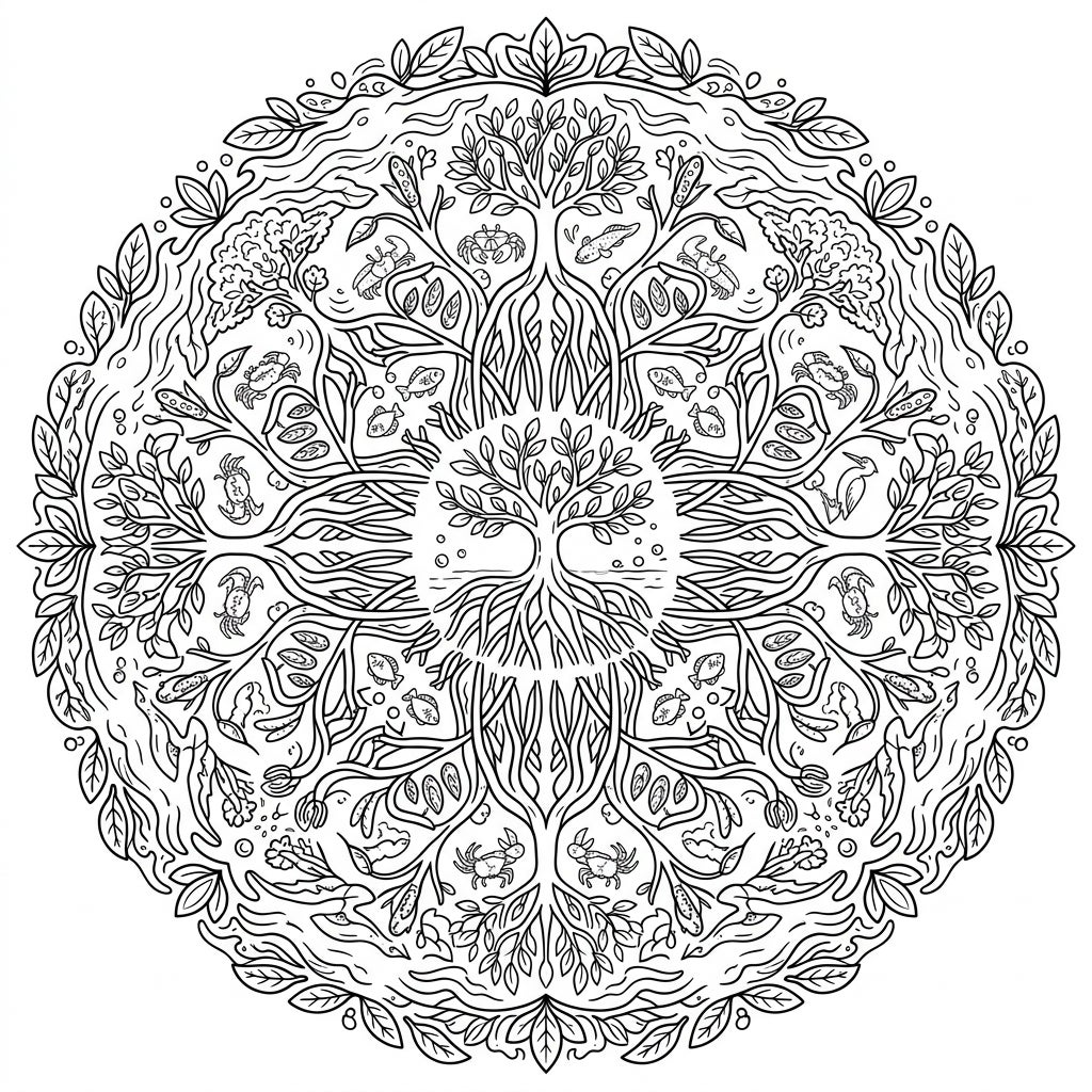 Immerse yourself in the symmetrical beauty of this intricate Mangrove Forest Mandala. This detailed coloring page combines the vital wonders of coastal wetlands with the calming art of mandalas for a unique creative experience.