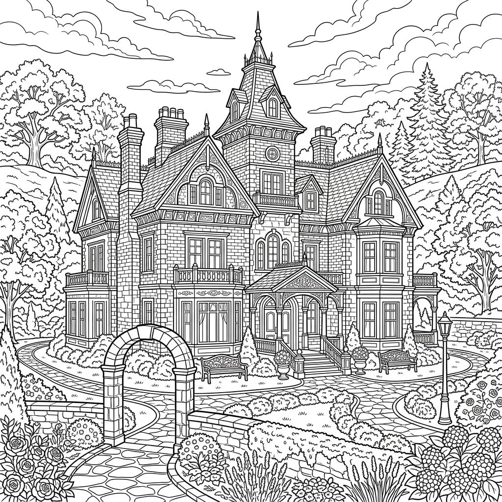Step into a world of architectural beauty with this exquisite coloring page featuring a magnificent Victorian mansion. Delight in bringing this stately home and its surrounding lush gardens to life with your favorite colors.