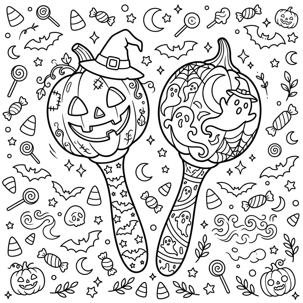 Dive into the festive spirit of Halloween with this delightfully detailed coloring page, showcasing two imaginative maracas redesigned for spooky fun. One maraca transforms into a grinning jack-o'-lantern, complete with a witch's hat perched jauntily atop its pumpkin head and decorative patches on its side. Its companion maraca, equally enchanting, features a swirling design filled with friendly ghosts, an intricate spiderweb, and a tiny witch's hat, creating a charmingly haunted shaker.