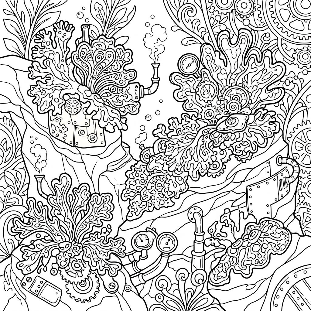 Discover the fascinating fusion of natural marine lichens and intricate steampunk mechanics in this unique coloring page. Unleash your creativity by bringing this industrial-organic landscape to life with your favorite colors.