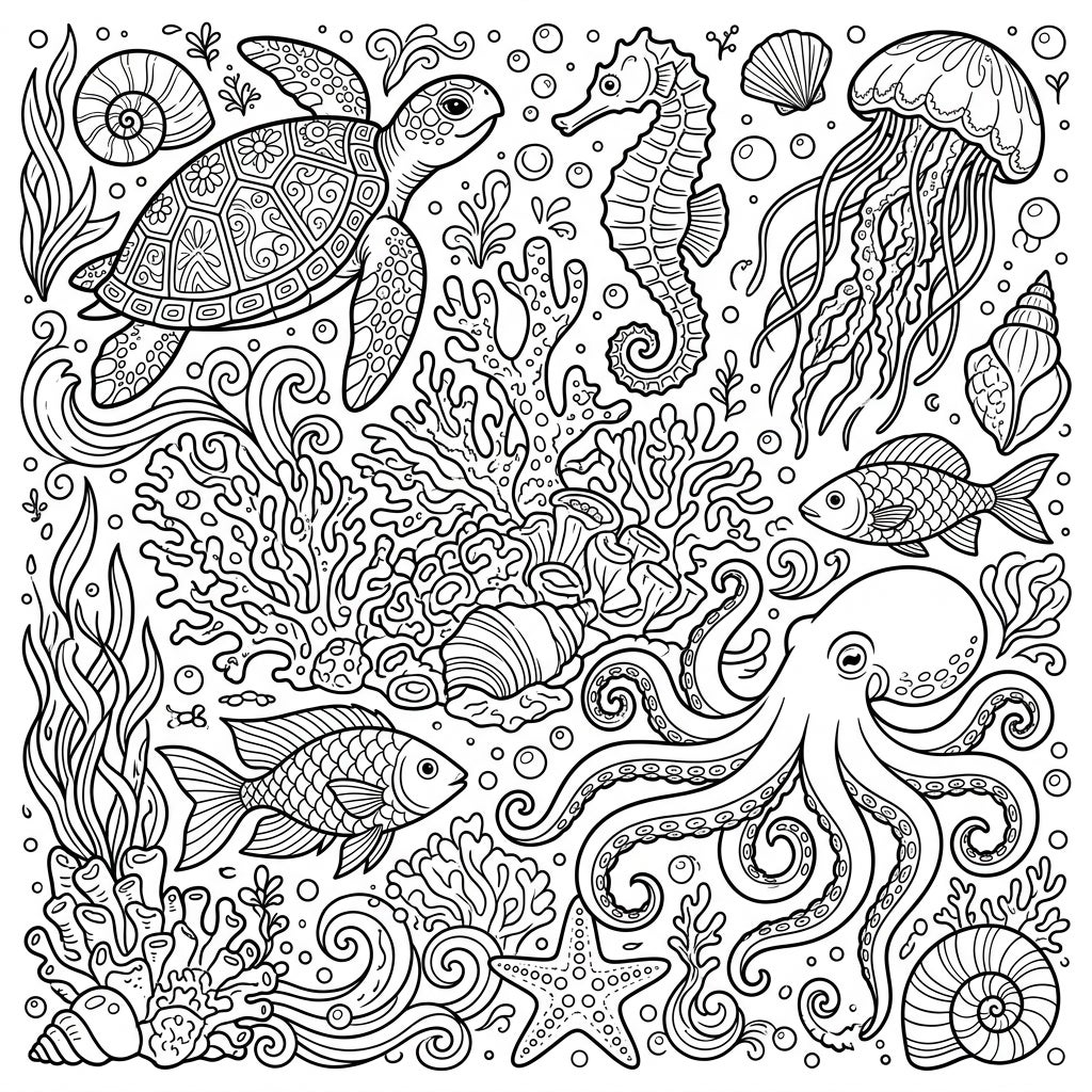 Embark on an artistic journey beneath the waves with this captivating adult coloring template. This richly detailed design showcases a bustling marine ecosystem, where a majestic sea turtle with patterned shell glides gracefully alongside a whimsical seahorse and a flowing jellyfish. Beneath them, an inquisitive octopus extends its intricate tentacles, while two scale-detailed fish navigate through a dense forest of complex coral formations, swaying seaweed, and scattered seashells. Every element, from the smallest bubble to the grandest sea creature, is rendered with meticulous linework, promising hours of engaging artistic exploration.