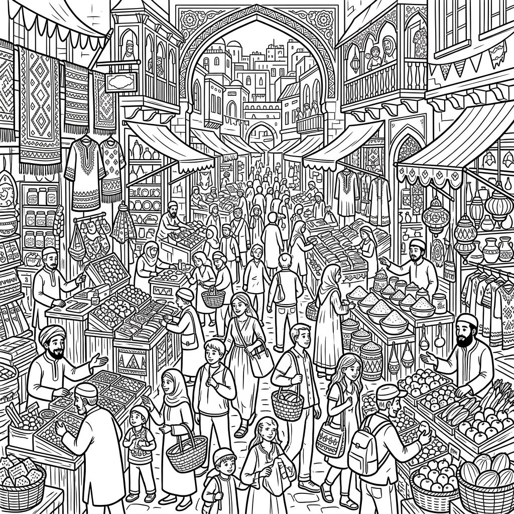 Unleash your creativity with this wonderfully detailed coloring page, capturing the lively energy of a traditional marketplace. Explore a rich tapestry of vendors, shoppers, and exotic goods, waiting for your artistic touch.