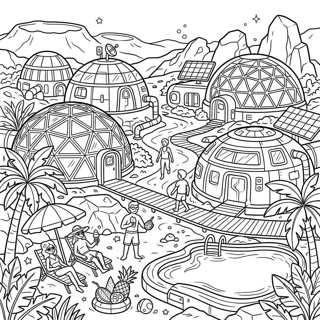 Unleash your creativity with a spectrum of possibilities! Consider classic Mars reds and oranges for the distant mountains and ground, contrasting with vibrant blues for the water and sky – perhaps a deep purple Martian sky? The geodesic domes offer fascinating geometric patterns to highlight with metallic or shimmering colors, while the various plants, fruits, and swim accessories provide a burst of tropical hues. Don't forget to add lively colors to the vacationers themselves, bringing their extraterrestrial summer day to full, colorful life!