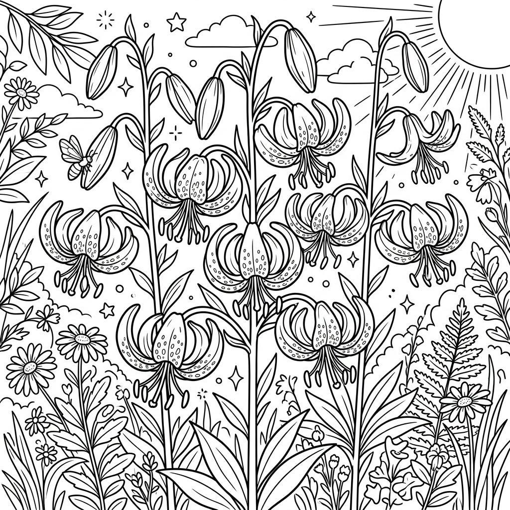 Step into a charming summer garden with our delightful Martagon Lilies coloring page. This intricate design showcases several tall Martagon lily stalks, each adorned with their characteristic 'Turk's Cap' flowers – petals gracefully recurved, creating a captivating bell-like shape. Look closely and you'll find charming details like delicate spots on the petals, a tiny butterfly fluttering by, and a variety of summer foliage, from feathery ferns to cheerful daisies, filling the scene with natural beauty.