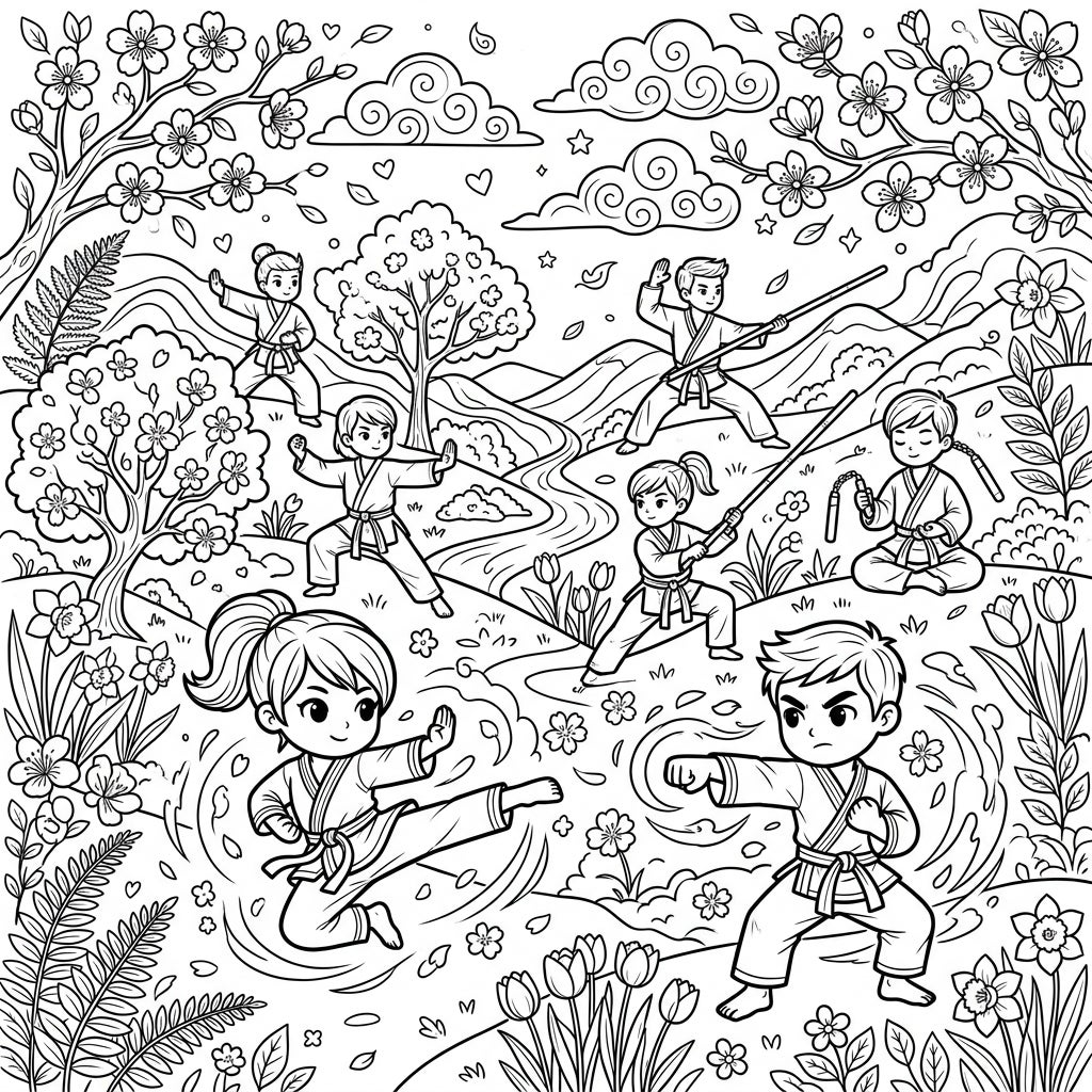 Experience the energy of martial arts combined with the beauty of spring in this engaging coloring page. Children practice powerful moves amidst a landscape bursting with flowers and vibrant nature, ready for your creative touch.