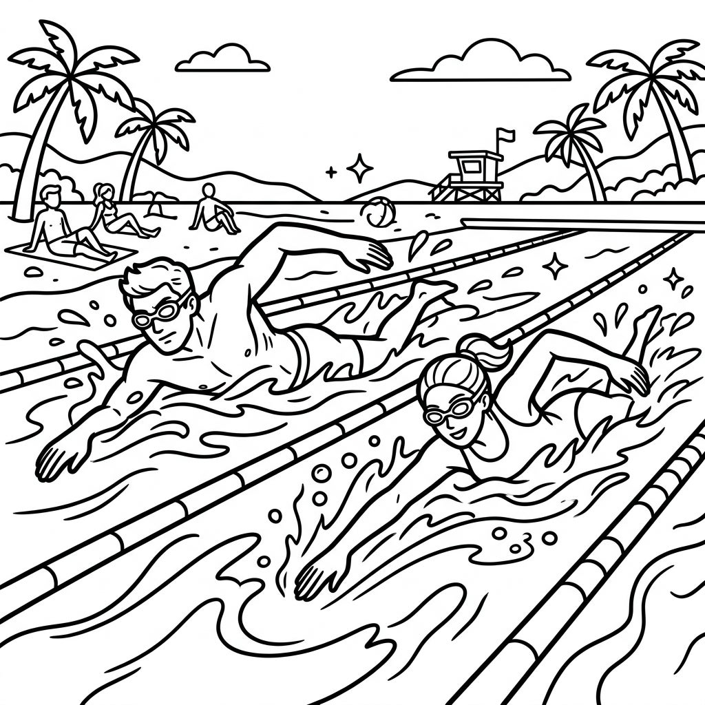 Get ready for a splash of color with this dynamic coloring page featuring master swimmers enjoying a vibrant summer vacation. This exciting scene is perfect for anyone who loves swimming, the beach, or simply unwinding with art.