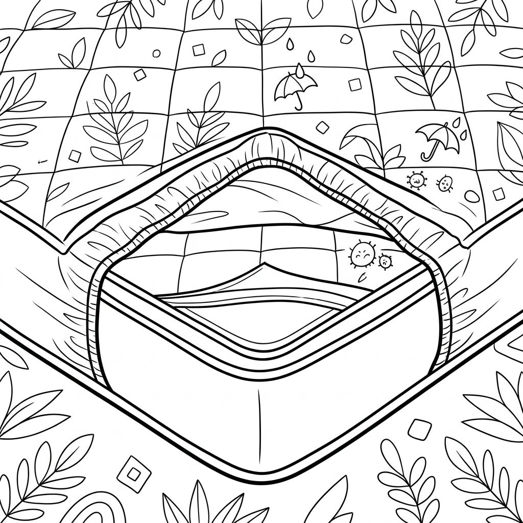 Discover the hidden world of mattress protection with this unique coloring page. Featuring detailed linear art, it playfully illustrates how a mattress protector keeps your bed clean and safe.