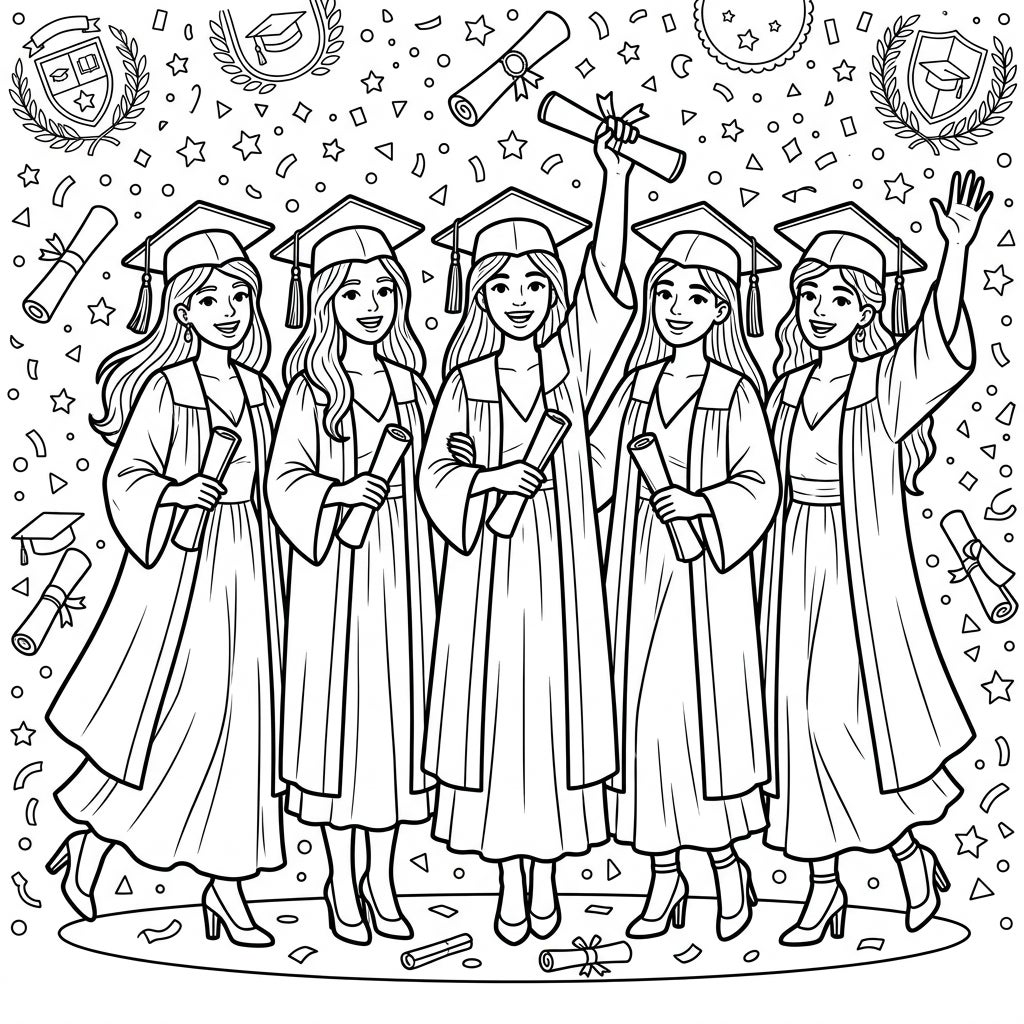 Unleash your creativity and personalize this momentous occasion with your favorite colors! Experiment with vibrant hues for their maxi dresses, traditional black or bold school colors for their gowns, and shimmering metallics for the confetti and stars. Whether you prefer markers, colored pencils, or even digital tools, this coloring page offers endless possibilities to bring this inspiring graduation scene to life. Share your masterpiece and celebrate the journey!