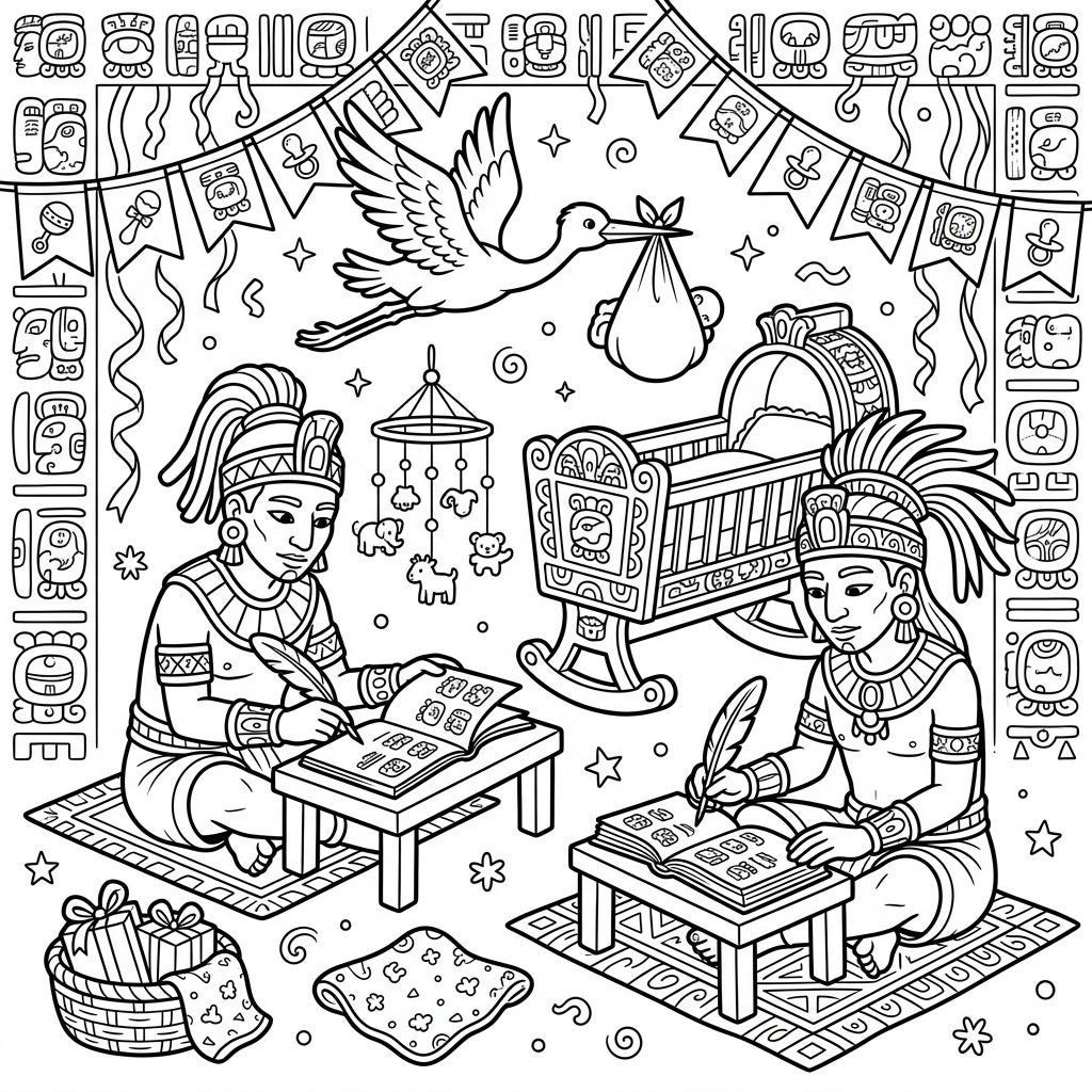 Step into a fascinating blend of ancient civilization and heartwarming celebration with this unique coloring page. Witness two dignified Mayan scribes, adorned in elaborate traditional attire and feather headdresses, diligently working on their texts at low tables. Surrounding them are delightful symbols of a baby shower: a graceful stork delivering a precious bundle, a charming baby mobile dangling playful animals, and an intricately carved rocking cradle, all set to welcome a new life.
