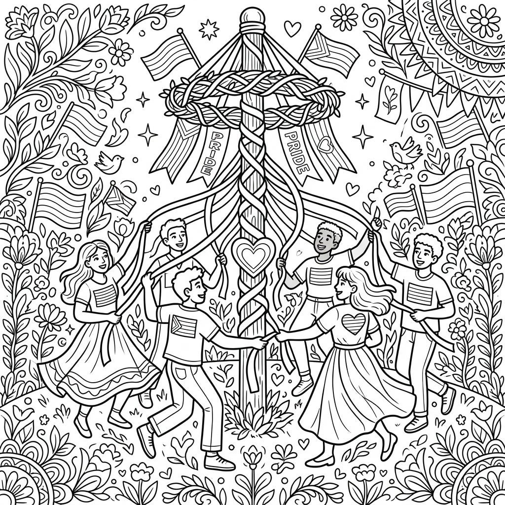 Immerse yourself in the joyful spirit of unity with this enchanting Maypole Dance coloring page, celebrating Pride Month. Discover a vibrant scene of dancers intertwining ribbons, adorned with symbols of love and diversity, ready for your creative touch.