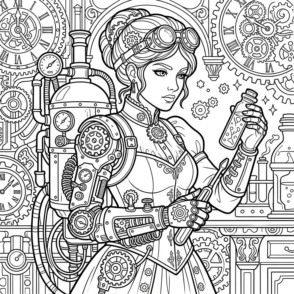 Immerse yourself in the rich, industrial Victorian fantasy setting that surrounds our medical marvel. The background is a dense tapestry of thematic Steampunk patterns, featuring large clock faces, elaborate gears, scientific apparatus, and ornate architecture, creating a vibrant world waiting for your artistic touch. Discover the subtle narrative of discovery and creation as she holds a bubbling flask and a scientific tool, embodying the spirit of invention and exploration inherent in the Steampunk genre.