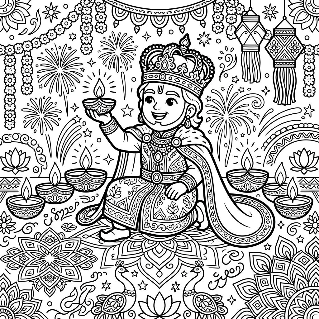 Step into a whimsical world where history meets festivity with this unique coloring page. A regal Medieval monarch joyously celebrates Diwali, ready for your creative touch.