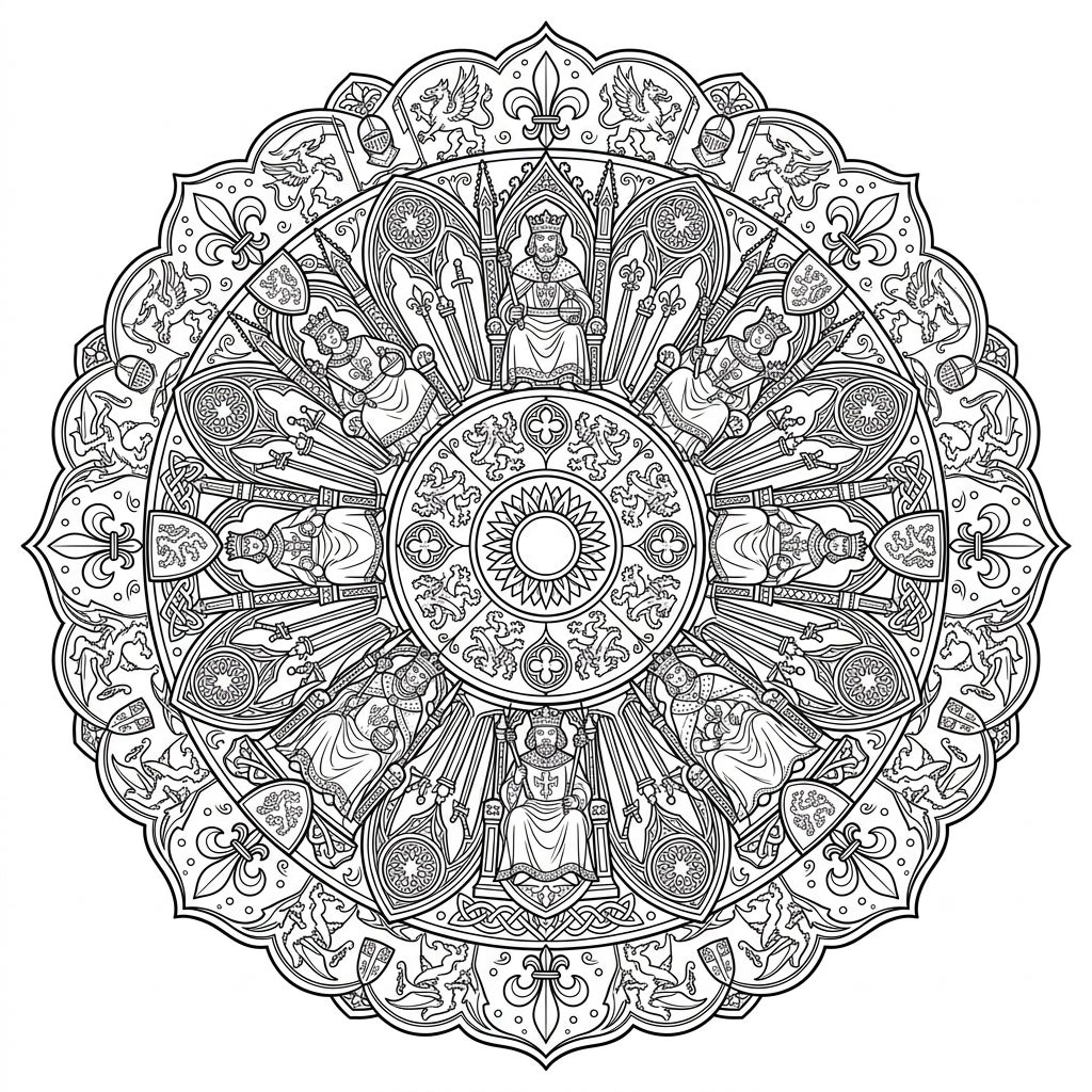 Delve into the grandeur of the Middle Ages with this magnificent mandala coloring page, showcasing majestic medieval monarchs. This intricate design promises a rich coloring experience for history enthusiasts and art lovers alike.