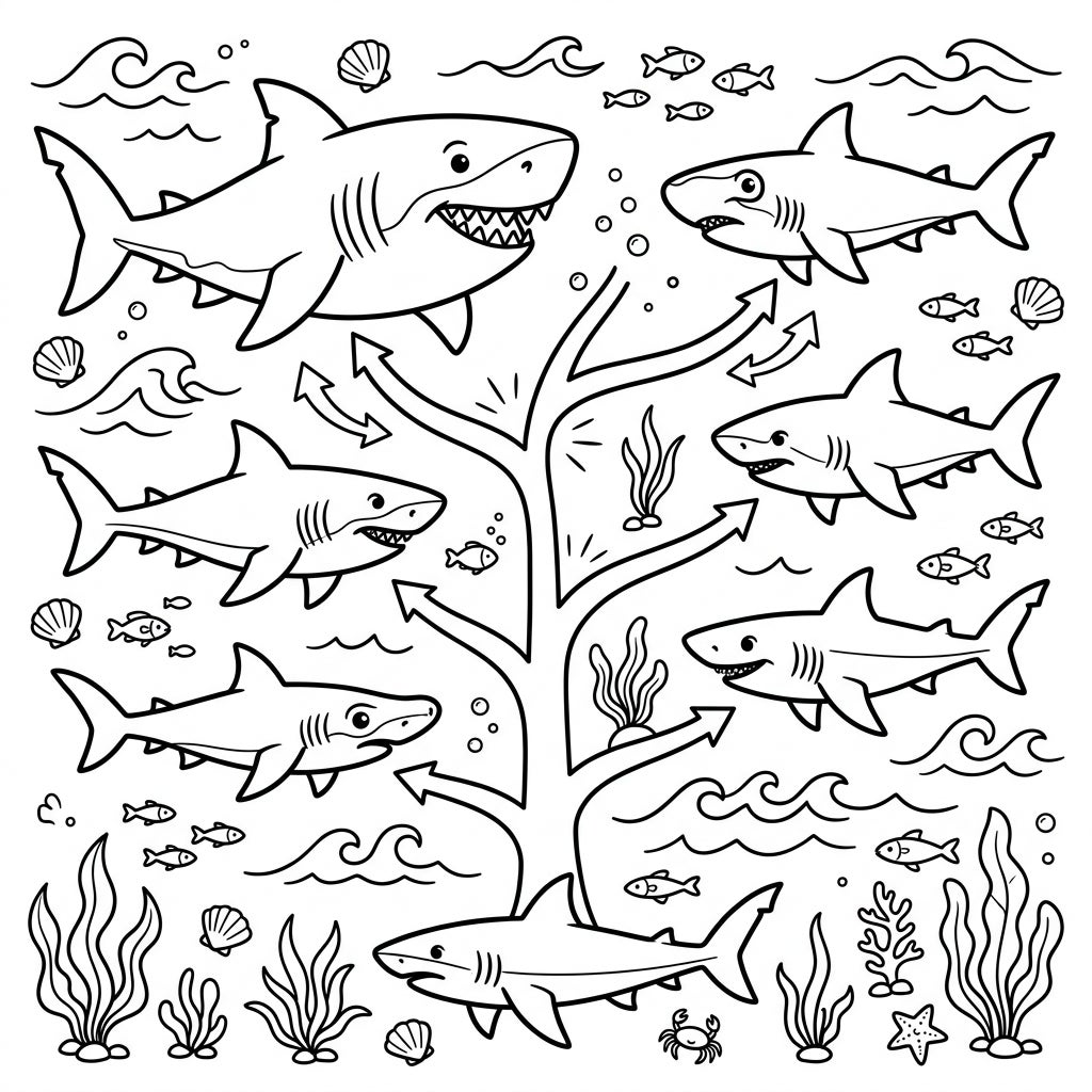 Journey through time with this captivating coloring page depicting the evolution of sharks, from ancient ancestors to the mighty Megalodon. Designed specifically for kids, it offers a perfect blend of educational fun and creative expression.