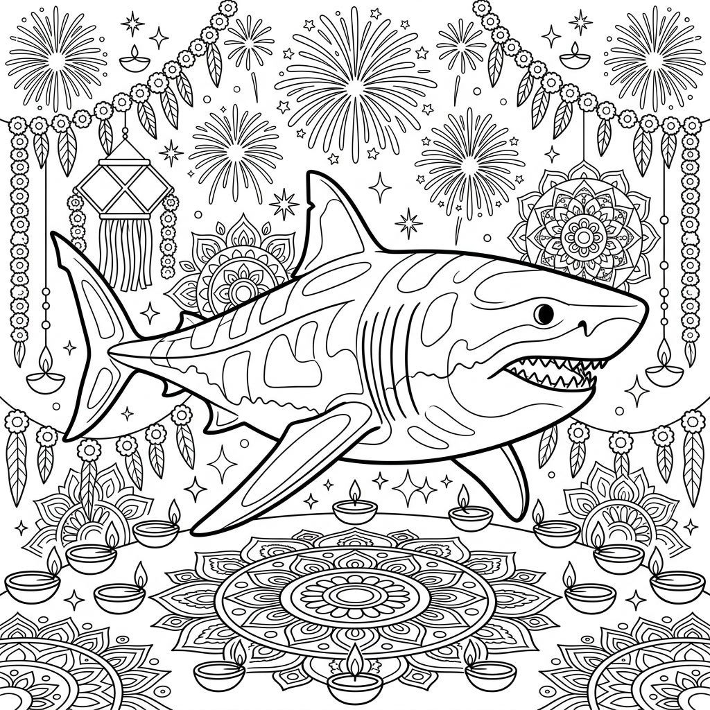 Experience an unprecedented blend of ancient marine power and vibrant festivities with our Megalodon Diwali coloring page. This unique design brings the awe-inspiring giant shark into a world of dazzling lights and traditional celebrations, ready for your creative touch.