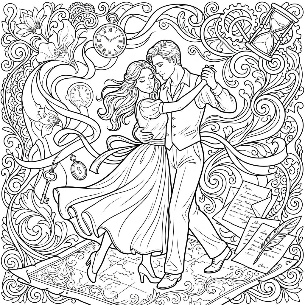 Immerse yourself in a beautifully detailed coloring page that captures the essence of Memory and Nostalgia. At its heart, a charming couple glides across the floor in a tender dance, their elegant movements framed by an abundance of intricate patterns. Look closely to discover symbolic elements like timeless clocks, a delicate hourglass, an antique key, and scattered love letters, all woven into a rich tapestry of swirling ribbons and flourishing botanical designs.