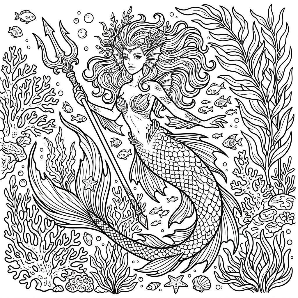 Delve into the oceanic splendor with our exquisite Merfolk coloring template, a detailed illustration brimming with mythical charm. This majestic merfolk, a captivating cryptid of the deep, is beautifully rendered with flowing, intricate hair adorned with a delicate crown, and a powerful, scaled fish tail. She gracefully holds a trident, presiding over her underwater domain, her elegant form ready to be brought to life with your personal artistic touch.