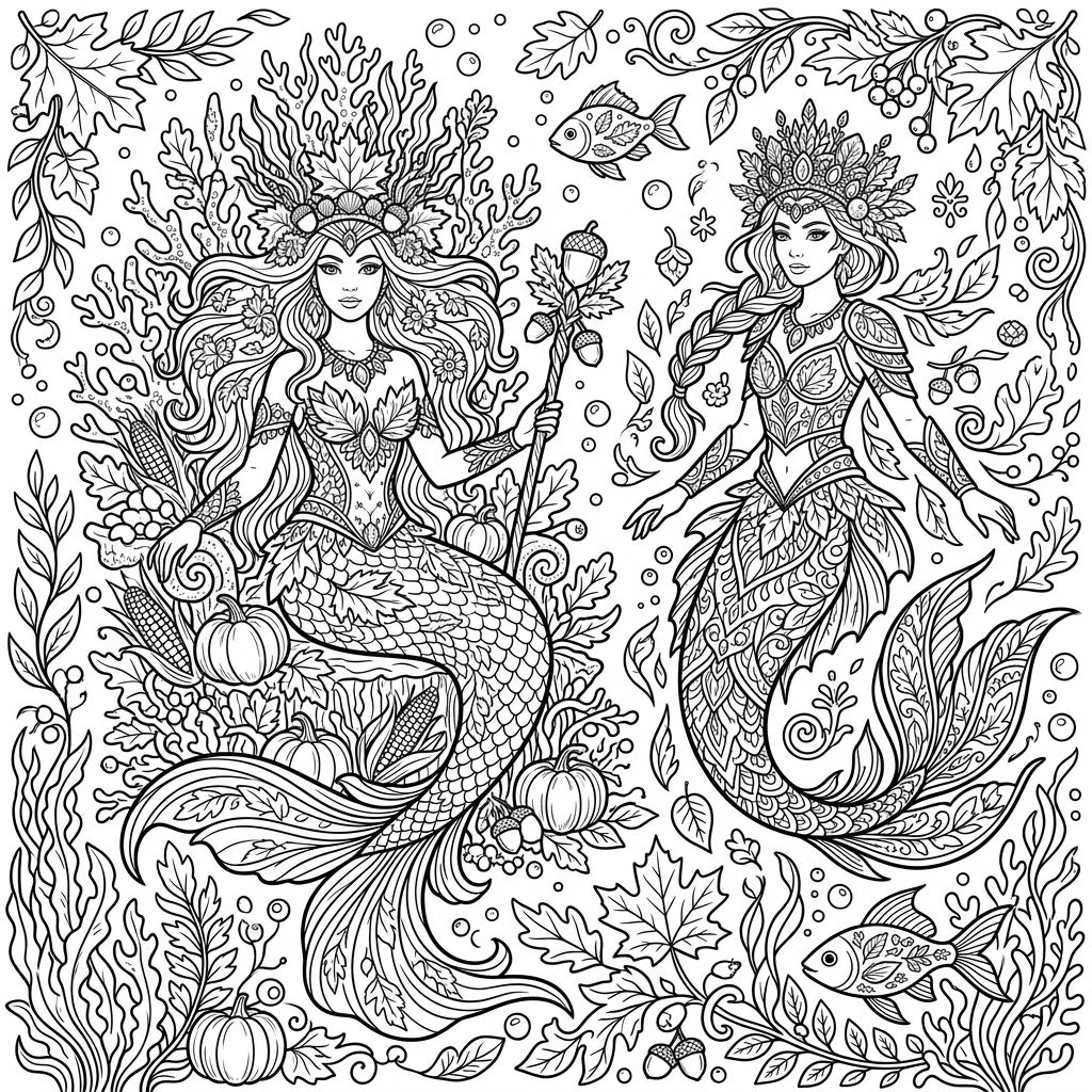 Delve into the whimsical world where sea meets season with this exquisitely detailed coloring page featuring two magnificent Autumn Mermaid Queens. Each queen is adorned with crowns and attire intricately woven from falling leaves, berries, and harvest elements, blending their aquatic grace with the cozy spirit of fall. Surrounding them is a lavish tapestry of oak leaves, acorns, pumpkins, and corn, creating a rich visual feast for your coloring adventure.