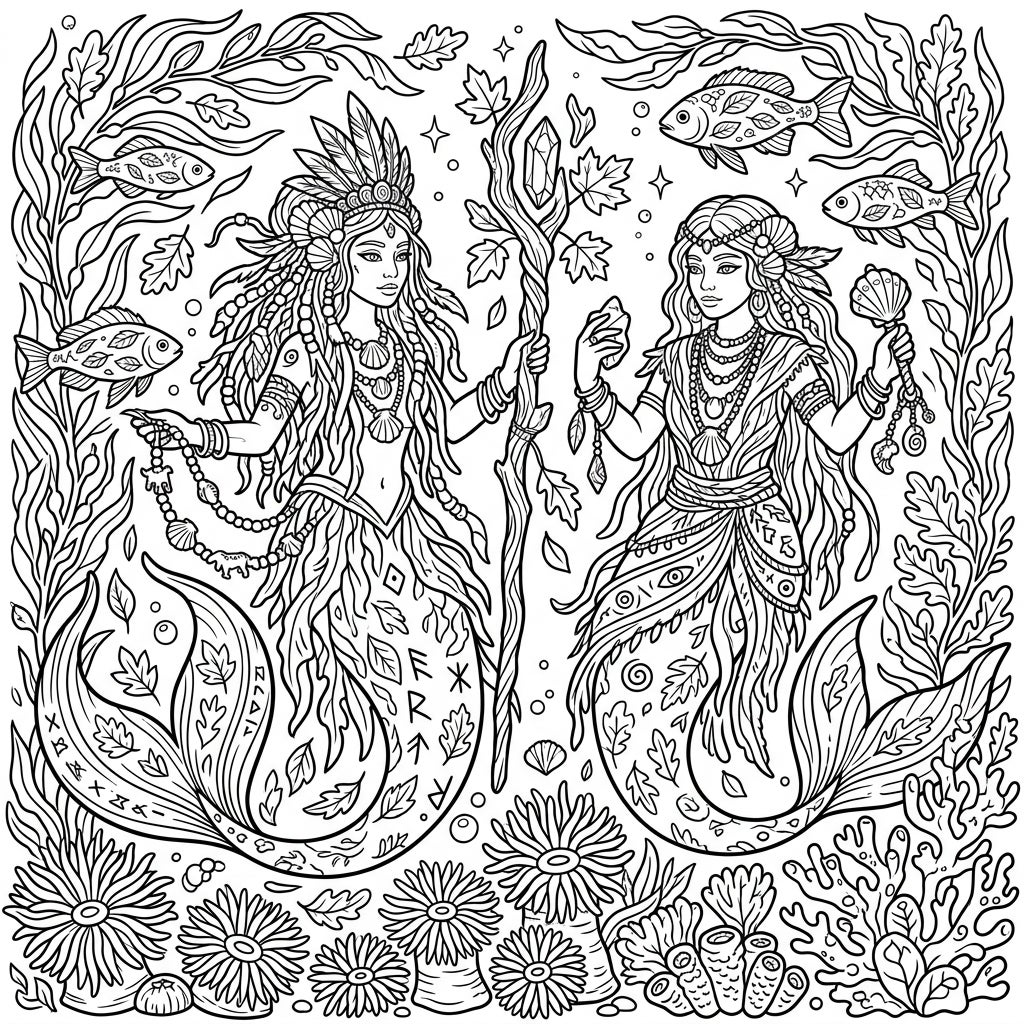 Unleash your creativity with this mesmerizing coloring page featuring two majestic mermaid shamans amidst a vibrant underwater autumn landscape. Observe the intricate details of their attire: one shaman sports a grand feathered headdress and wields a staff adorned with sparkling crystals and oak leaves, while her companion holds a mystic shell rattle. Their flowing hair, draped with beads and seashells, complements their beautifully patterned tails, which are intricately detailed with leaves and ancient runes, inviting you to explore every curve and symbol.