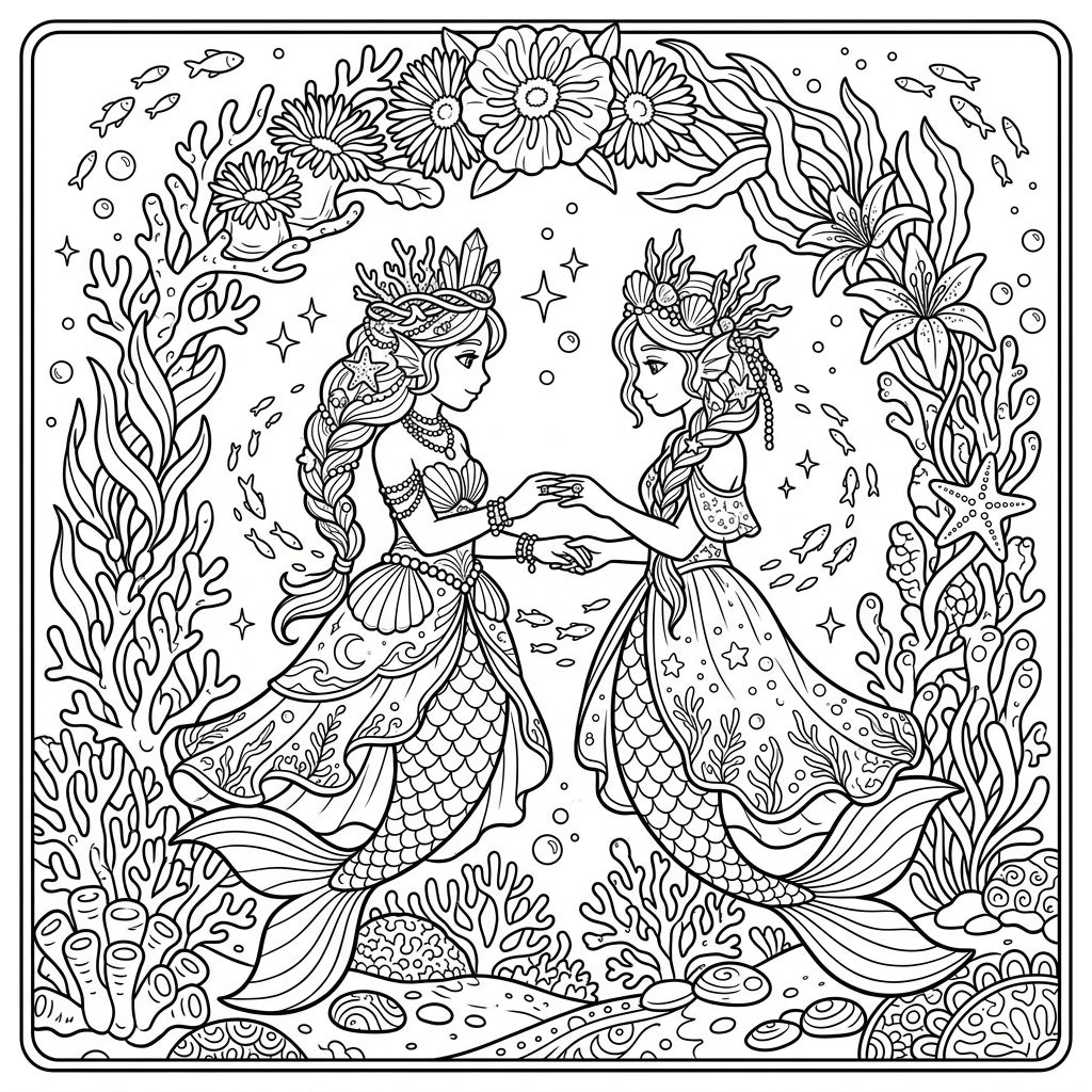 Explore an enchanting underwater wedding scene featuring two majestic mermaid shamans joining in a sacred ceremony. This beautiful design invites you to add vibrant colors to their elegant attire and the rich ocean environment.
