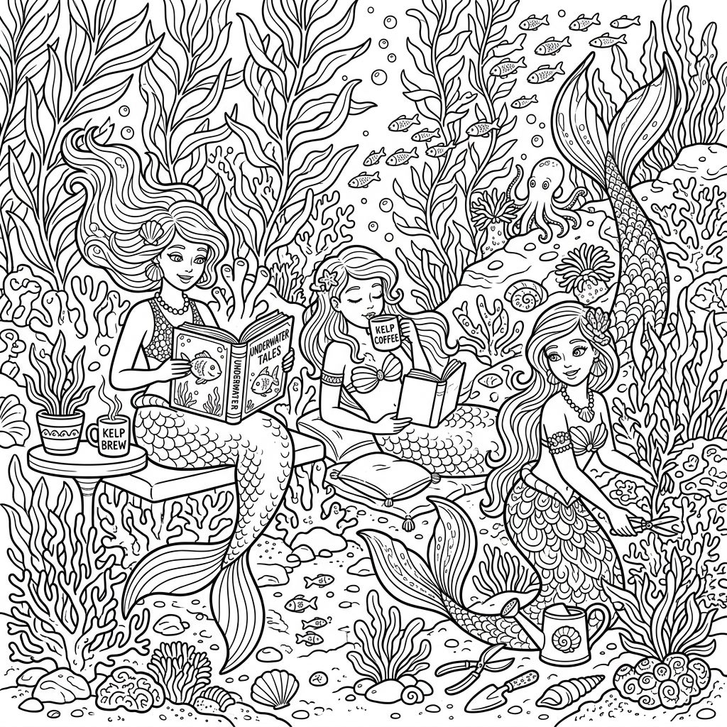 Discover a captivating black-and-white coloring page illustrating three enchanting mermaids enjoying a peaceful weekend beneath the waves. One mermaid is deeply engrossed in a book titled 'Underwater Tales,' her 'Kelp Brew' cup at her side, while another gracefully reclines, enjoying 'Kelp Coffee' and a good read. The third mermaid brings life to the aquatic garden, tending to vibrant underwater flora with her tiny gardening tools. The richly textured background showcases swaying kelp forests, delicate coral, schools of tiny fish, and scattered seashells, creating an immersive marine landscape for your artistic touch.