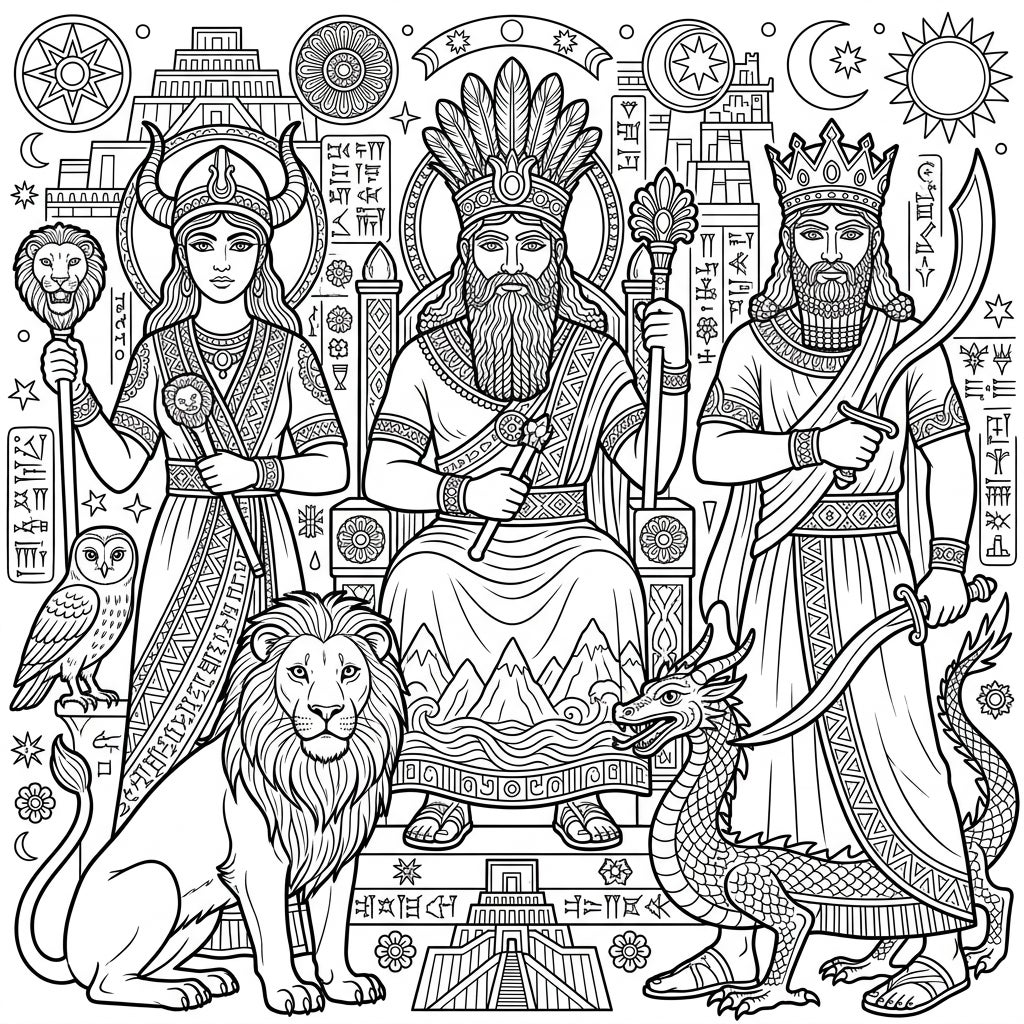 Unleash your creativity with this magnificent coloring page featuring powerful Mesopotamian deities and mythical creatures. Immerse yourself in the rich history of ancient Sumer, Akkad, Babylon, and Assyria as you bring these gods and their world to life.