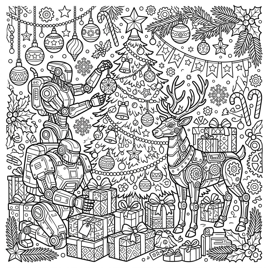 Unleash your creativity on this densely detailed canvas. Consider using metallic shades for the robots and reindeer, contrasting them with vibrant traditional Christmas colors for the tree and decorations. Experiment with different textures and patterns to bring the gifts and background elements to life. This coloring page offers endless possibilities to explore the fascinating blend of technology and holiday spirit, making it an ideal project for both seasoned colorists and those looking for a festive challenge.