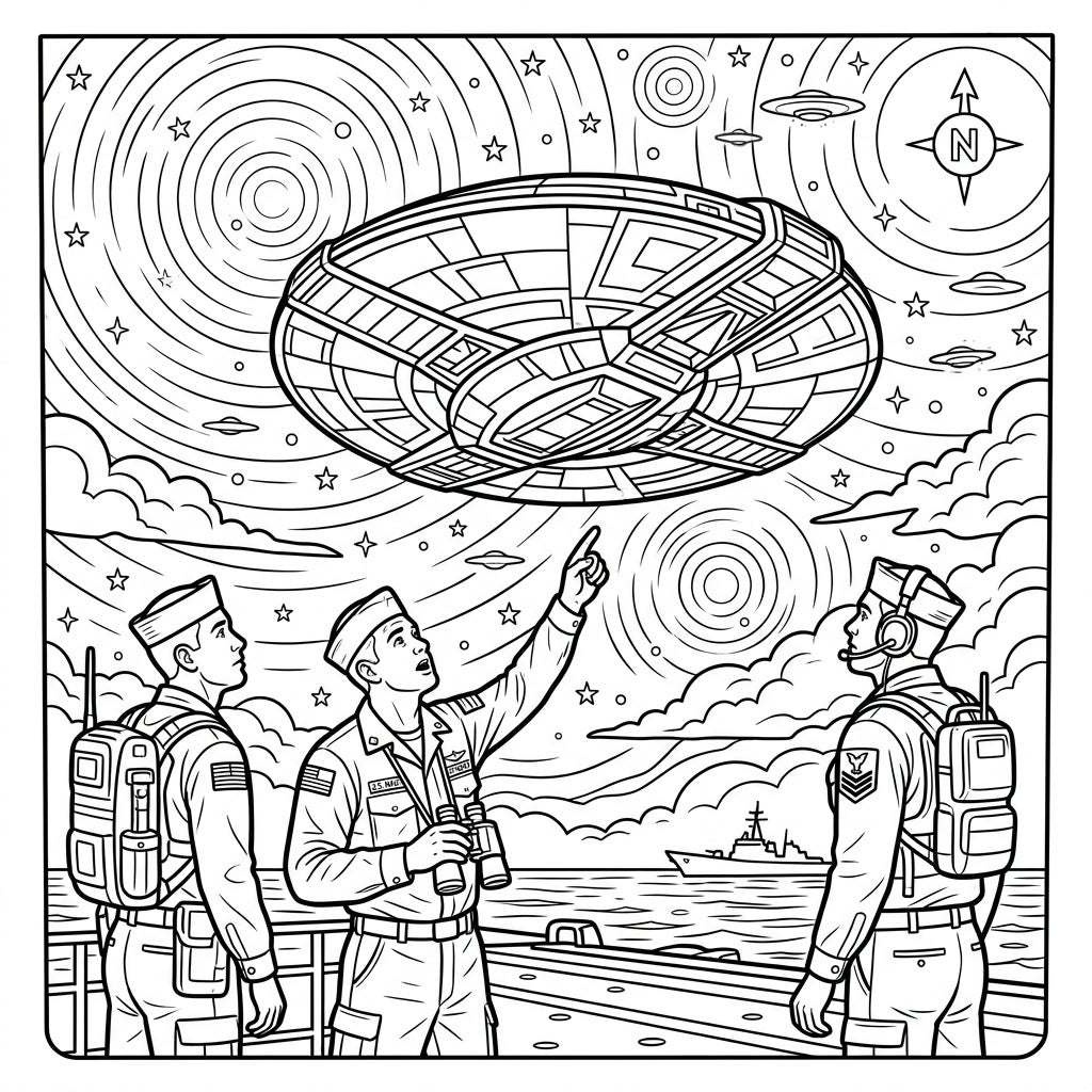 This intricate coloring page captures a dramatic scene of a military UFO encounter. Three uniformed personnel stand on the deck of what appears to be a naval vessel, their attention fixed upwards. Above them, a large, detailed flying saucer hovers, its complex structure inviting a myriad of coloring possibilities, while smaller, classic UFO shapes dot the star-filled, swirling sky.