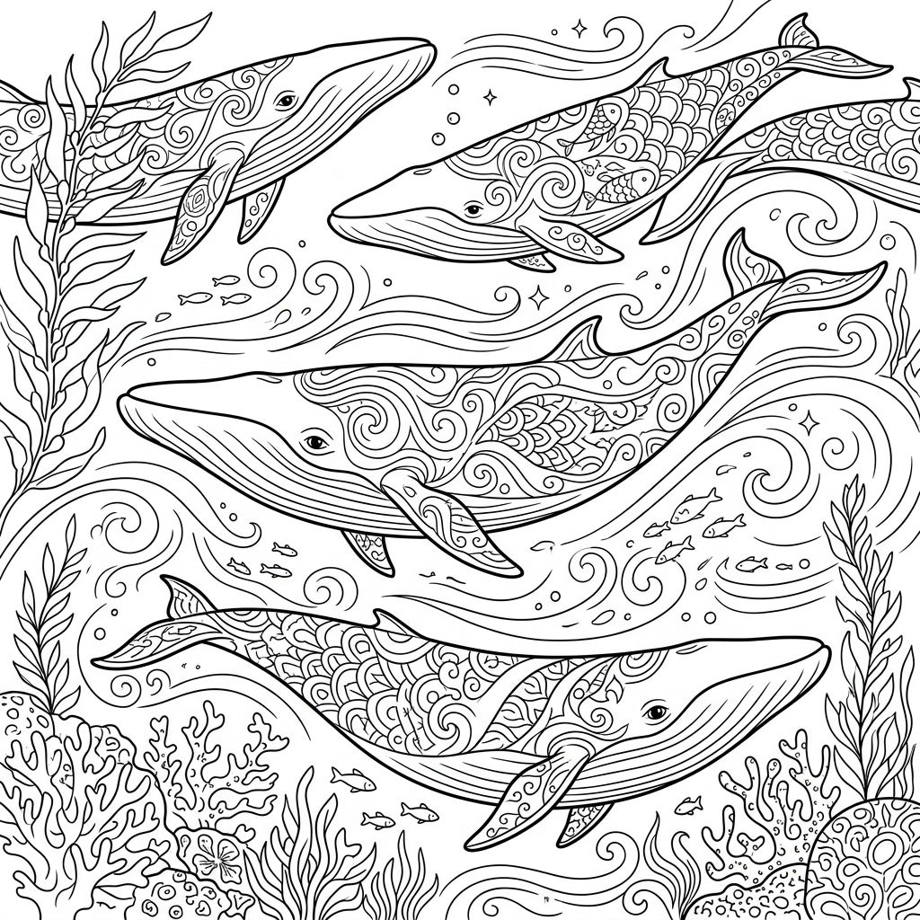 Discover a mesmerizing underwater world with our Minke Whales coloring template. This intricate design showcases several majestic Minke whales gracefully navigating a vibrant ocean scene, surrounded by flowing seaweed, delicate coral, and schools of tiny fish. Each whale is adorned with beautiful, soothing patterns and swirls, inviting a detailed and engaging coloring experience.