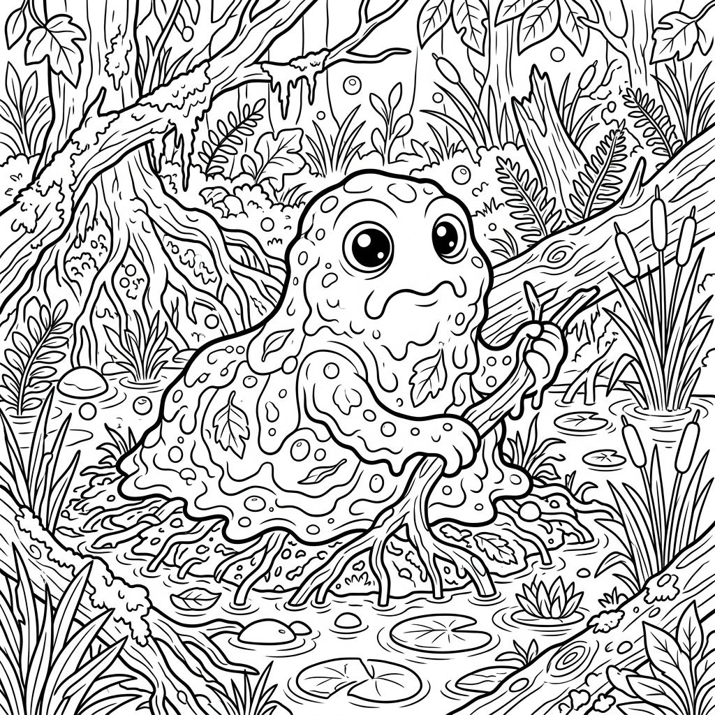 Discover a whimsical mire slime nestled in a detailed swamp, perfect for a calming coloring session. This engaging design features clear lines and ample space, making it ideal for seniors seeking comfort and creative expression.
